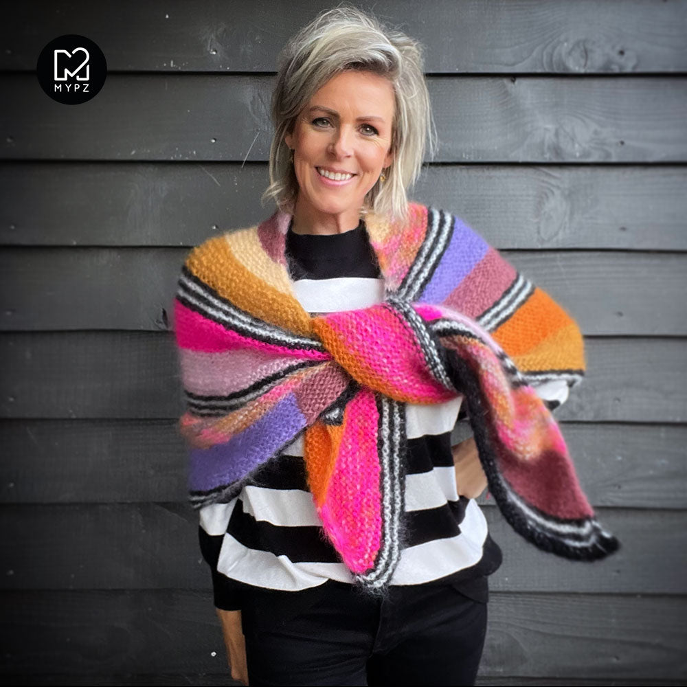 This soft warm shawl is a pleasure to wear and lightweight. This kit contains MYPZ Chunky Kidmohair DK, a high quality fine brushed mohair that does not pill.