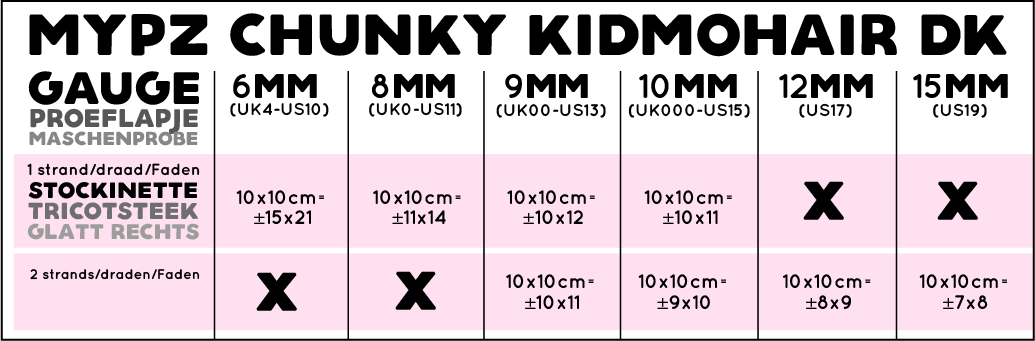 For our Basic Chunky mohair pullover you need: ± 800 meter MYPZ Chunky Kidmohair DK (+100m M/L) (+200m XL/XXL)